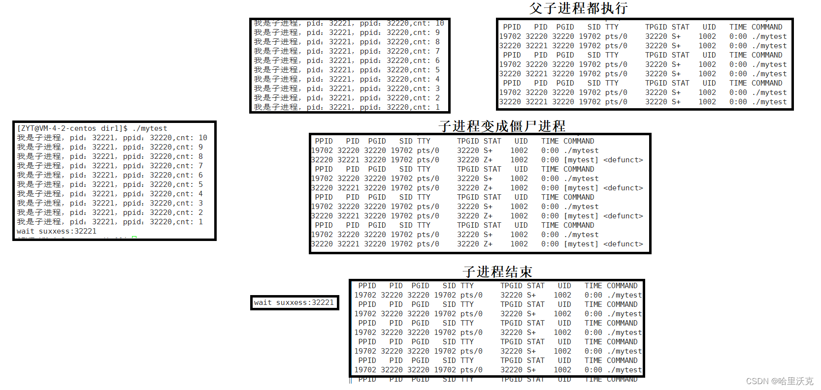 #include #include #include #include #include int main() { pid_t id = fork(); if(id < 0) { printf("fork error\n"); return 1; } else if(id == 0) { int cnt = 10; while(cnt) { printf("我是子进程,pid:%d,ppid:%d,cnt: %d\n",getpid(),getppid(),cnt--); sleep(1); } exit(0); } else { sleep(15); pid_t ret = wait(NULL); if(ret>0) { printf("wait suxxess:%d\n",ret); } } sleep(5); return 0; }