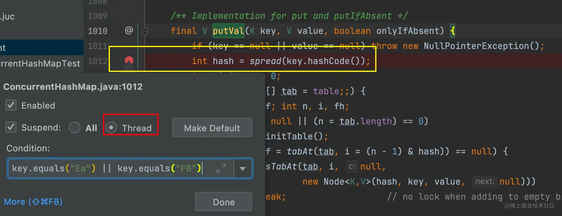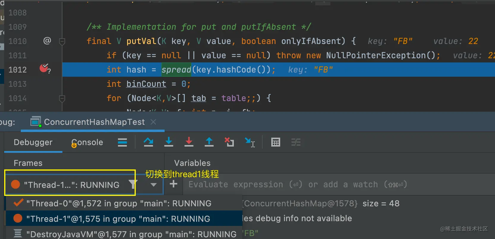 接下来我们就从"thread1"视角看它是如何协助扩容的,首先要切换到"thread1"线程