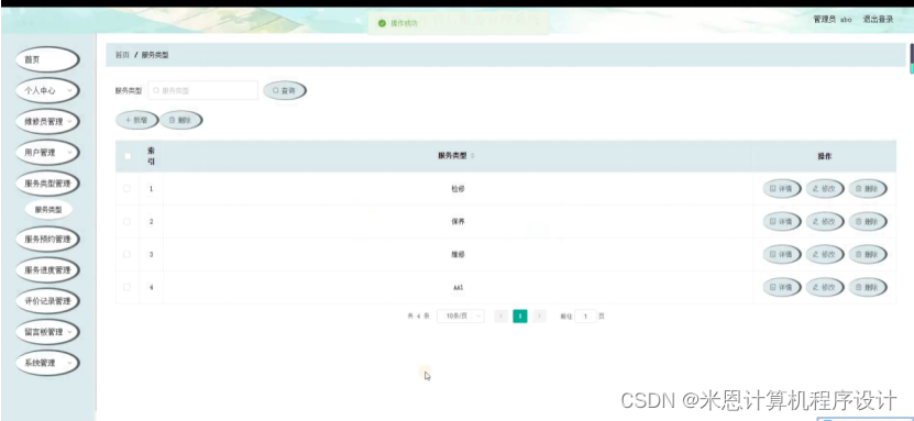 管理员登录系统后,可以对首页、个人中心、维修员管理、用户管理、服务类型管理、服务预约管理、服务进度管理、评价记录管理、留言板管理、系统管理等功能进行相应的操作管理,如图5-5所示。