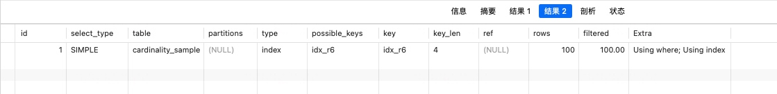 索引 idx_r6 的基数由之前的 100 提升到 32w 多。所以即使同样的字段,同样的过滤条件,不同的索引基数值以及基于索引基数值的索引选择性高低的不同,也会让优化器选择不同的执行计划。