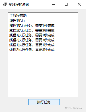 - textBox1.Text += "线程2执行任务,需要3秒完成" + Environment.NewLine;