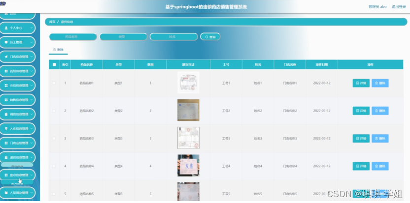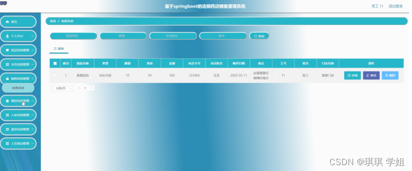 销售信息管理;在销售信息管理页面中可以对索引、药品名称、类型、数量、售价、金额、会员卡号、会员姓名、购买日期、备注、工号、姓名、门店名称等内容进行详情和删除操作;如图5-7所示。