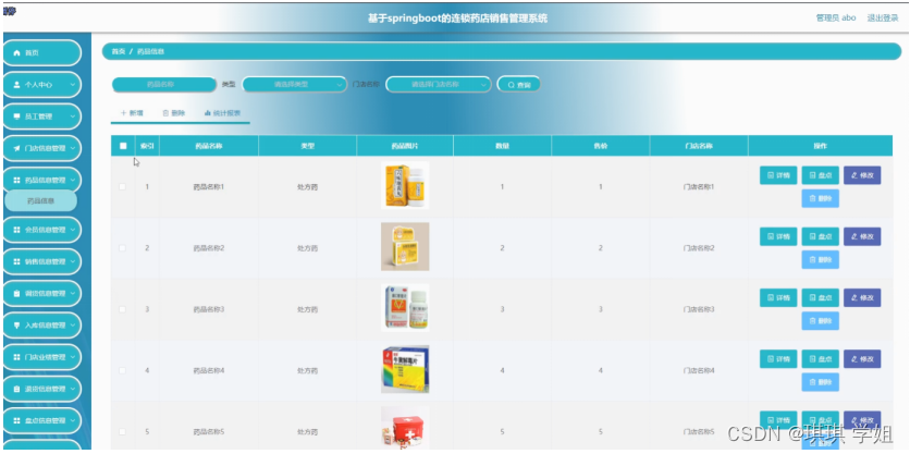 药品信息管理;在药品信息管理页面中可以对索引、药品名称、类型、药品图片、数量、售价、门店名称等内容进行详情,盘点,修改和删除操作;如图5-5所示。