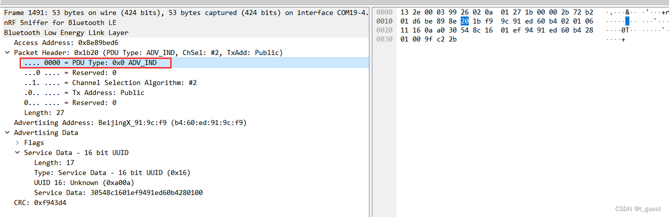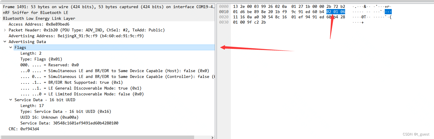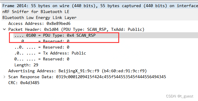 因为SCAN_RSP是对SCAN_REQ的回应,所以其中会包含一些其他的信息。这些信息是程序中自己设置的。此次抓的包中内容为外貌和设备名称。scanner也就是获得了这些内容,才知道扫描到的设备是什么类型,叫什么名字。