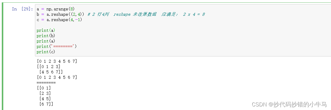 - b = a.reshape((2,4)) # 2 行4列 reshape 未改原数组 应满足: 2 x 4 = 8