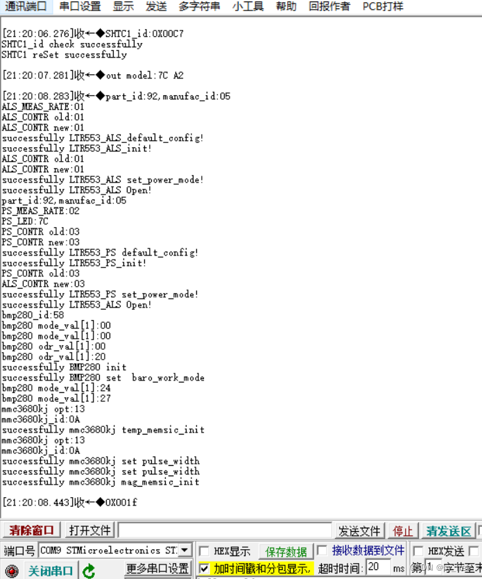 在主函数循环中,加入对各个传感器数据读取以及显示输出,设置了一个菜单标识menu,按键可以改变它:按键KEY0清屏,按键KEY1实现I2C2接口读取(stch1、ltr553、bmp280)数据及显示;按键KEY2实现I2C4接口读取(LSM6DSL、MMC3680KJ)数据及显示。