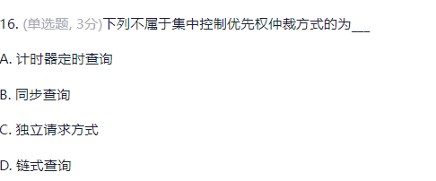 仲裁方式分为集中控制优先权仲裁方式和分布控制优先权仲裁方式,其中集中控制优先权仲裁方式分为三种:链式查询方式,计数器定时查询方式和独立请求方式,所以该题选B。