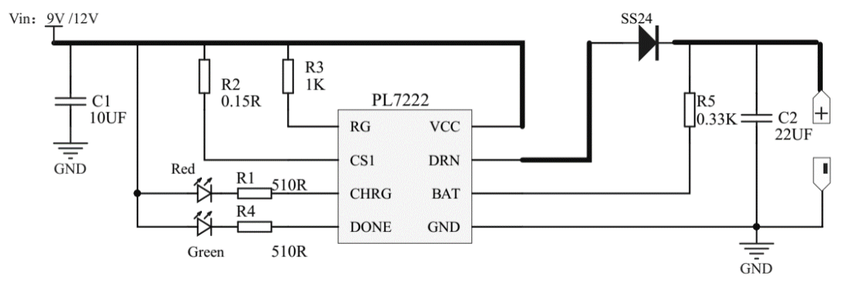 双节/两节锂电池串联充电芯片和与 PL7022B 搭配电路: