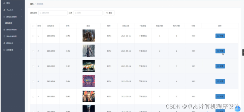 游戏信息管理:在游戏信息管理页面可以获取索引、游戏名称、分类、图片、制作、发售日期、下载地址、收藏次数、购买次数、价格等信息,进行用户评价操作,如图5-11所示。