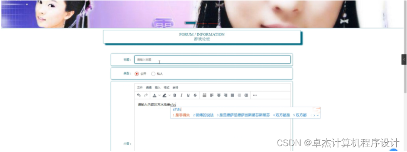 游戏论坛:在游戏论坛页面通过填写标题、类型、内容等信息进行发布帖子,如图5-7所示。