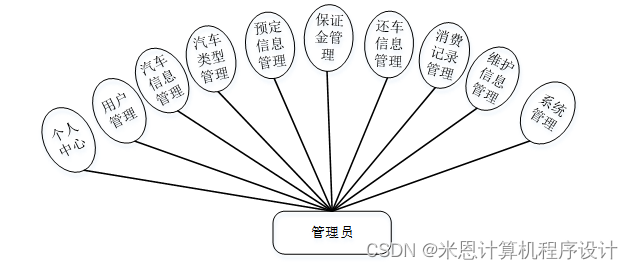 通过市场调研及咨询研究,了解了共享汽车系统及管理者的使用需求,于是制定了管理员和用户等模块。功能结构图如下所示: