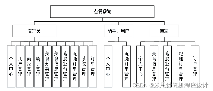 考虑到实际生活中在点餐系统管理方面的需要以及对该系统认真的分析,将系统权限按管理员、用户、商家和骑手这四类涉及用户划分。