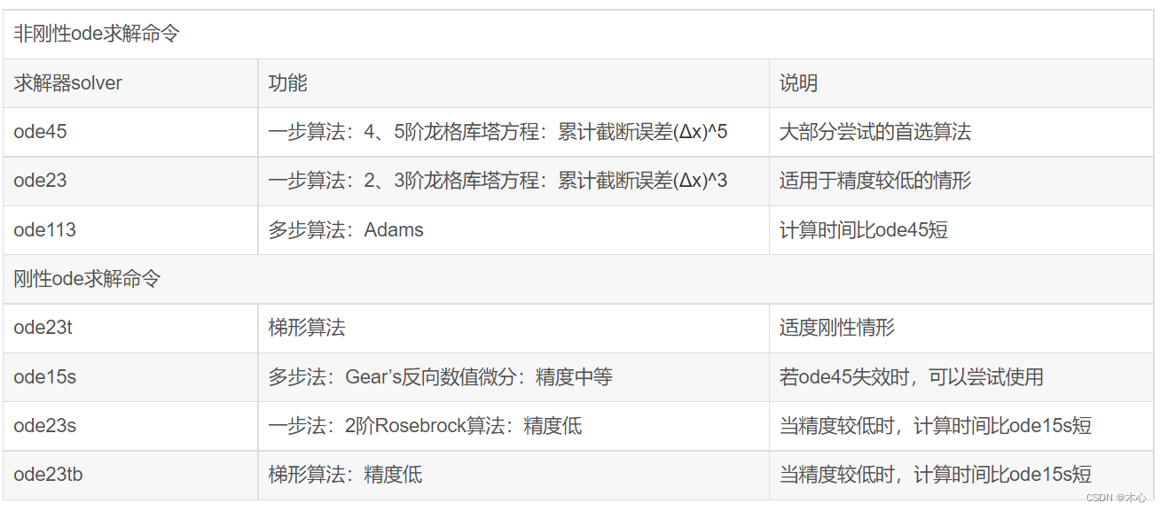 求数值解,有一些非线性的常微分方程是不能求出解析解的,我们一般求取其在一段区间内的数值解,采用迭代的方式来求解数值解,ode是matlab专门用于解微分方程的功能函数,具体的说明如下: