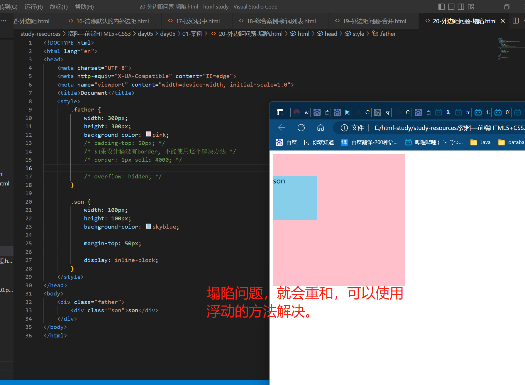 - ➢ 场景:互相嵌套 的 块级元素,子元素的 margin-top 会作用在父元素上
