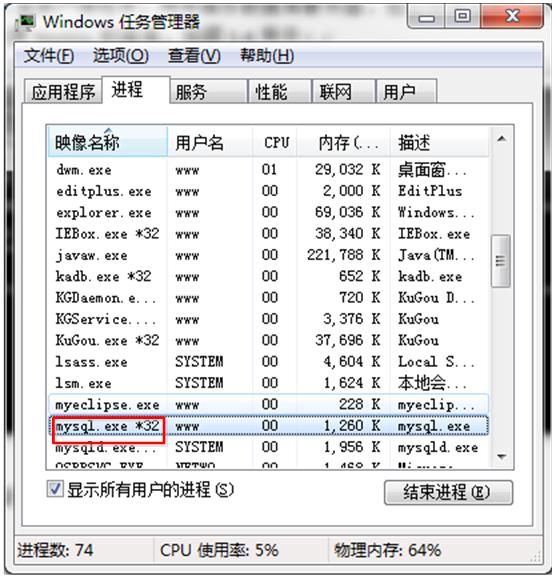图1-6中,当我们在dos窗口中再次连接数据库时,任务管理器中又有一个名为mysql.exe的进程。