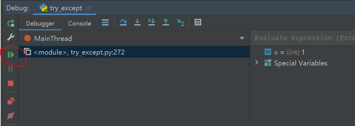 发现目前没出现错误,想继续执行可以点击底部弹窗的执行按钮,会执行后续所有的代码(如果后续仍有断点,则执行到下一个断点)