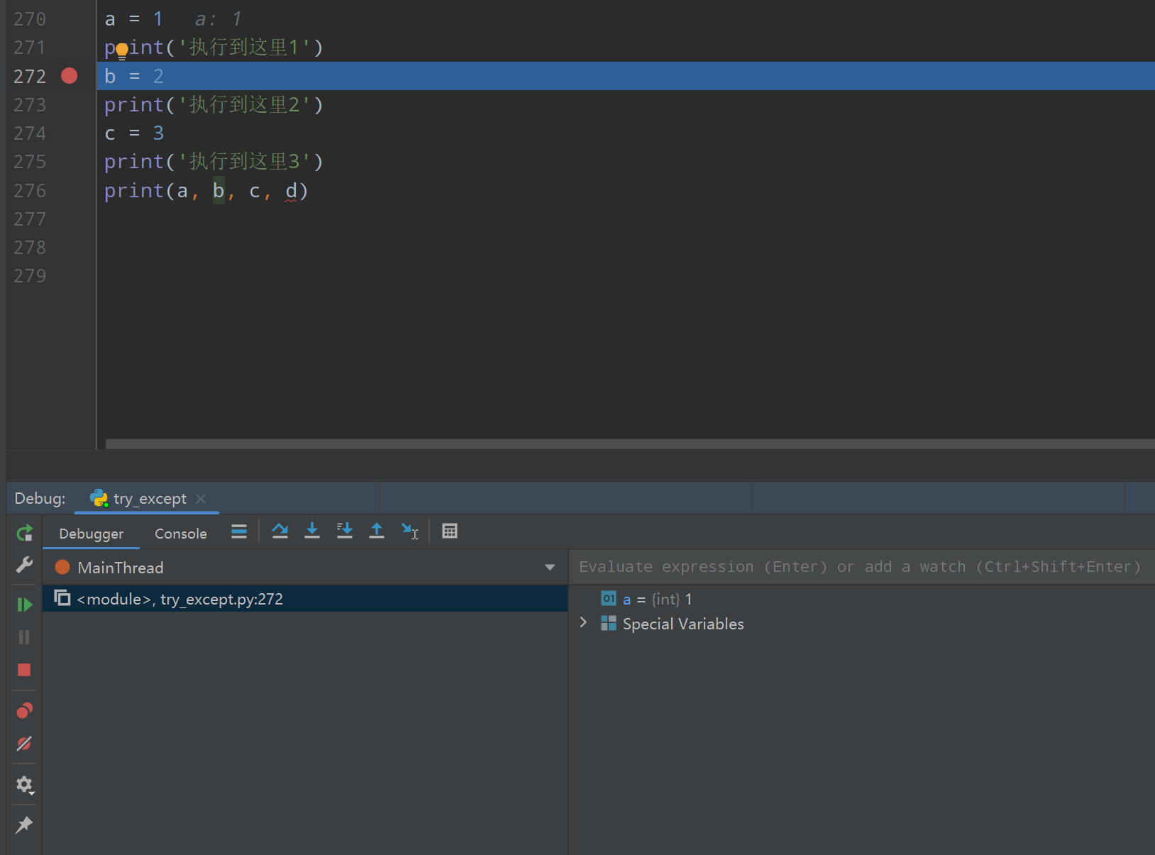 # (目前代码量较少,程序已直接打印出了出错的位置,代码调用层级较多时,调试效果会更大些)