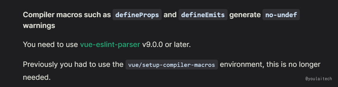.eslintrc.js关键配置(v9.0.0及以上版本无需配置编译宏vue/setup-compiler-macros)如下 :parser: 'vue-eslint-parser', extends: [ 'eslint:recommended', // ... ],重启