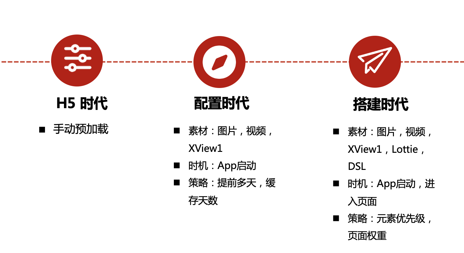 搭建时代: 支持图片,视频,webview,Lottie,DSL 文件等预加载,在App启动或者进入目标页面时会触发预加载,预加载的元素的优先级会根据权重,优先级组合条件进行排序决定预加载先后顺序。