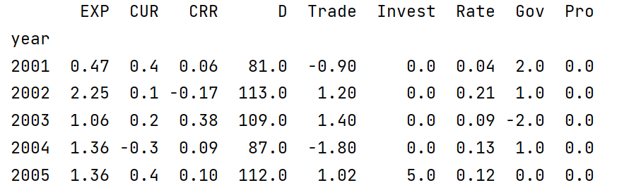 df=pd.read_excel("时间序列的多元回归分析.xlsx") data=df.copy() data.set_index('year',inplace=True) #展示部分所用数据 print(data.head())