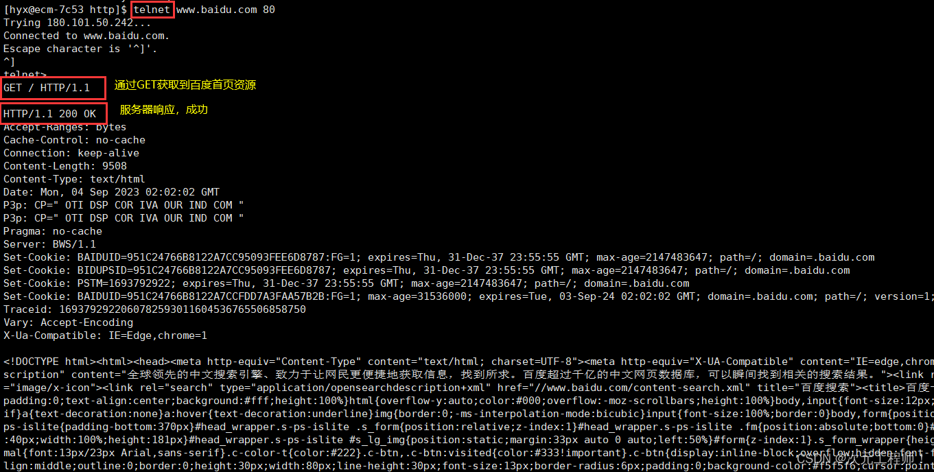 我们从网站上获得、请求到的各种资源,大多是GET方法。例如我们想获取百度首页,我们先telnet连接到百度,然后GET: