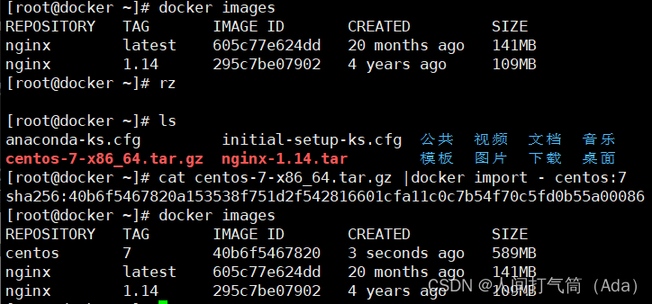 [root@docker ~]# cat centos-7-x86_64.tar.gz |docker import - centos:7
