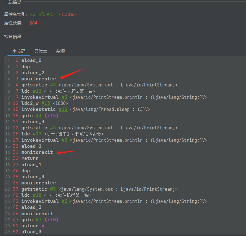 5.可以看到这里是有这一对锁指令的,这里稍微解释下上写字节码指令的含义