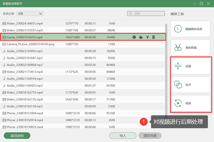 第3步:录制结束后,视频会弹出预览,我们还可以在录制历史中找到它,在这里对视频进行压缩、合并等处理。