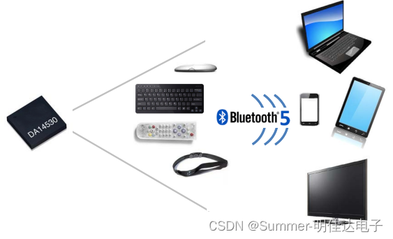 DA14530是一款超低功耗蓝牙5.1 SoC。它集成了2.4 GHz CMOS收发器和ARM®Cortex-M0+微控制器,具有48 kB RAM和32 kB一次性可编程(OTP)存储器。无线电收发器、基带处理器和合格的Bluetooth®低功耗堆栈完全符合Bluetooth®低功耗5.1标准。它具有用于BLE链路层实施的专用硬件和用于增强连接功能的接口控制器。