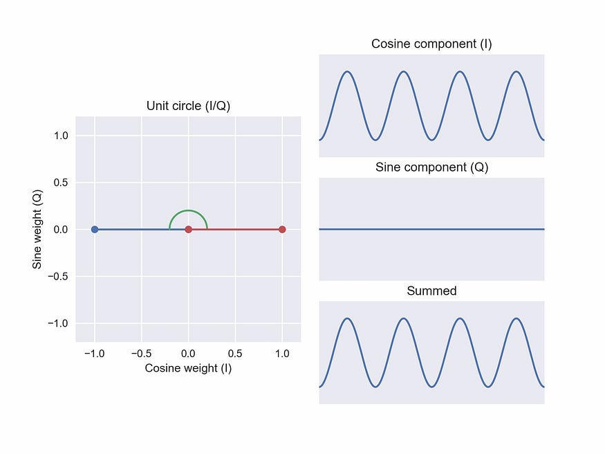 让我们画出这个同相、正交空间。在x轴上,我们绘制了我们想要多少余弦(即余弦函数上的“同相”权重)。在 y 轴上,我们绘制了我们想要多少正弦(即正弦函数上的“正交”权重)。我们可以可视化两个加权分量和加权总和(图 4)。我们将这个新空间称为 I/Q 来描述两个轴:(i)n 相和 (q)uadrature
