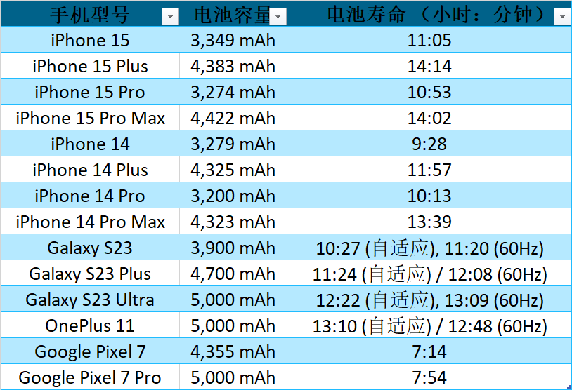 Galaxy S23 Plus在自适应模式下持续11:24,在60Hz模式下持续12:08,因此比iPhone 15 Plus少了约2小时。OnePlus 11最长持续时间为13:10,比苹果的设备少了一个小时。