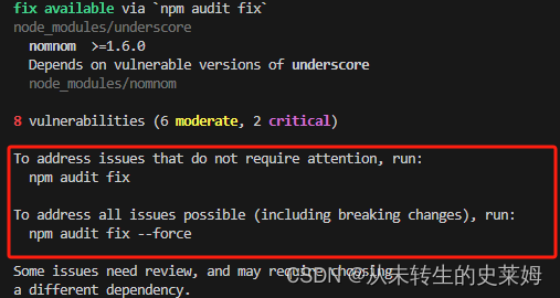 (npm audit fix 含义: 检测项目依赖中的漏洞并自动安装需要更新的有漏洞的依赖,而不必再自己进行跟踪和修复。)
