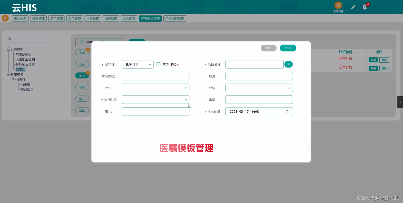 公共模板在全院可用,科室模板只适用于科室医生。新增模板时点击鼠标右键,填写模板名称,添加模板内容。