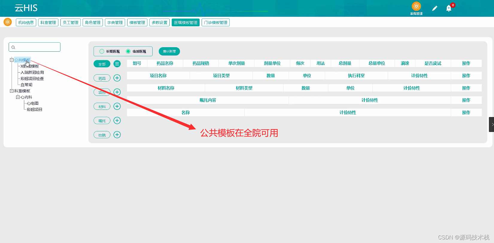 8.医嘱模板管理:医嘱模板管理是对住院部经常使用的长期或临时医嘱模板进行管理,设置好医嘱模板后医生可以通过系统直接调用医嘱模板,避免大量的重复性操作。