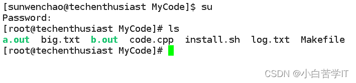 如果我们当前用户是普通用户账号想要切换成root账号的话,我们可以通过使用su [root] (root可以省略)命令,然后回车,会让我们输入密码,密码是root账号的密码,当我们输入正确的时候他就会如上图所示。