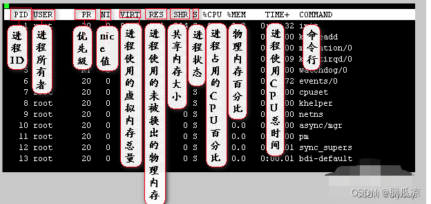 至于top命令以后的每个项目怎么看,这里列出来,CPU怎么看