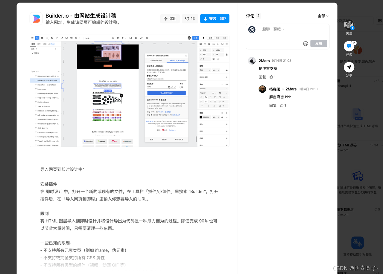 使用 Builder.io 插件可以通过输入网址自动生成网站页面的可编辑设计稿。这极大节省设计师提取页面元素的时间,尽管存在一些已知限制,但可以完成大部分工作。