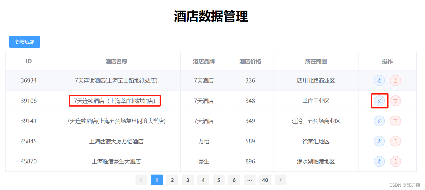 a)在酒店管理页面中,修改 “7天连锁酒店(上海莘庄地铁站店)” 为 “7天连锁酒店(此处正在施工,请谨慎前往)”,如下.