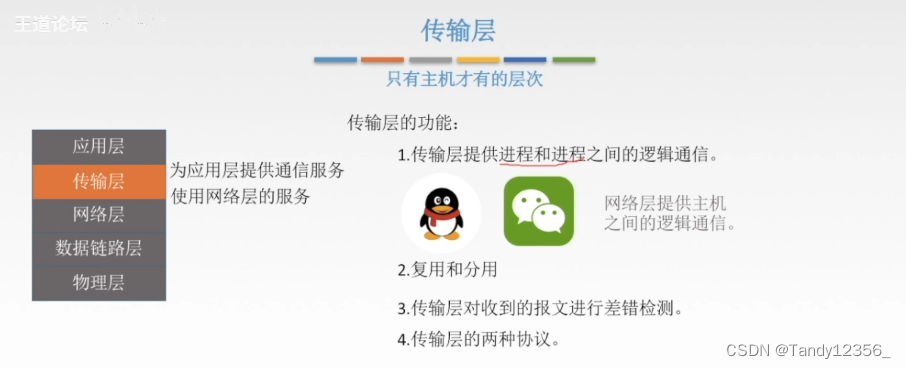 分用:接收方的传输层在去除报文段的首部之后能把数据交给正确的应用进程
