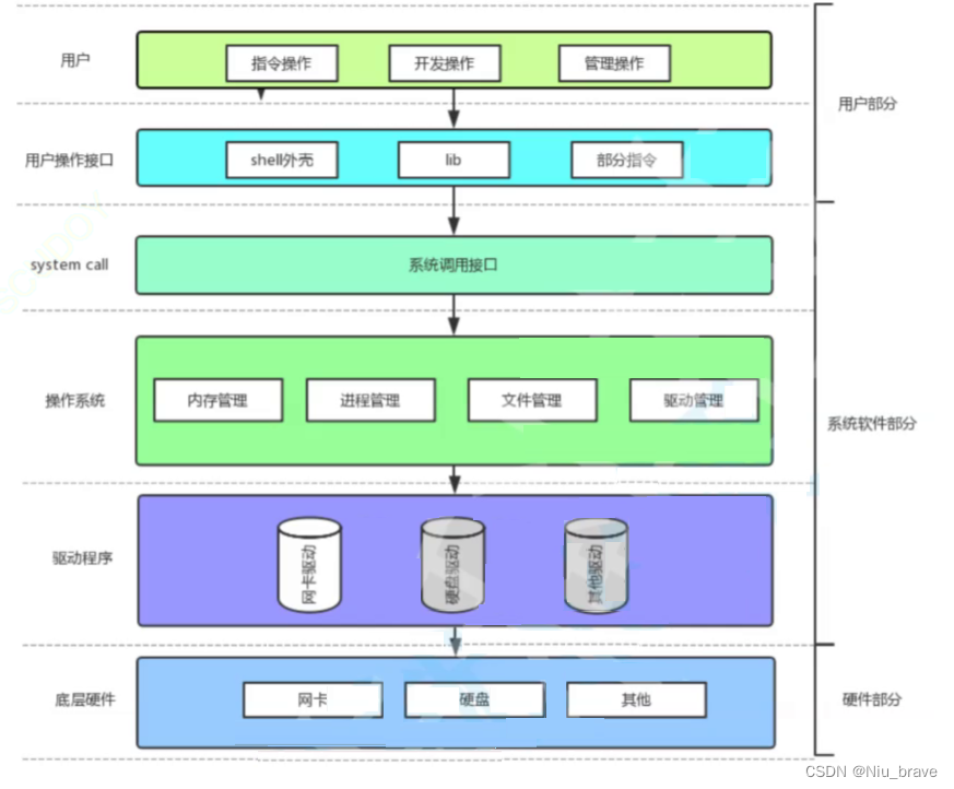 可以看到操作系统便在这个层状结构的中间位置。所以计算机在运行时传输数据的时候必定要经过操作系统。操作系统管理的只是一些数据,而不是具体的硬件。Linux操作系统其实有狭义和广义之分,狭义的操作系统便是Linux内核。广义的操作系统便是Linux内核+系统调用接口+lib库。如下图: