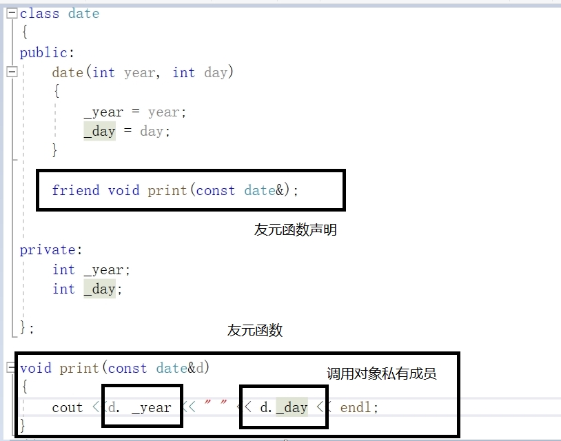 友元函数:非成员函数,但需要把函数声明放在类声明里,并在函数声明最前面加一个friend,声明其是友元函数,此时函数可以调用类内的私有成员。