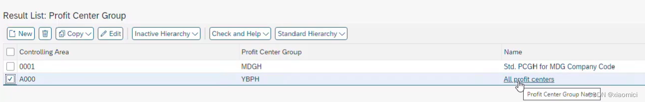 再往下的利润中心组是根据不同业务划分的。也就是个组名。再往下的利润中心节点,才是真正的主数据,需要维护利润中心名字,有效期,归属的控制范围,以及是哪个公司代码上的。
