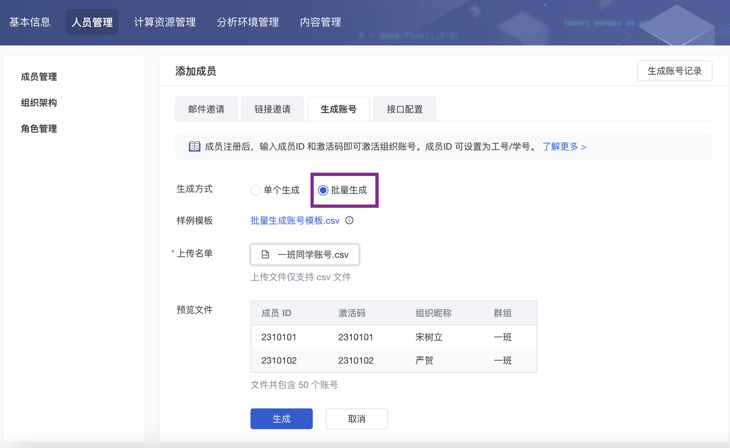 Tips:ModelWhale 也支持(1)上传 csv 文件批量生成账号;(2)通过第三方接口加入组织;如有需求可以联系我们。