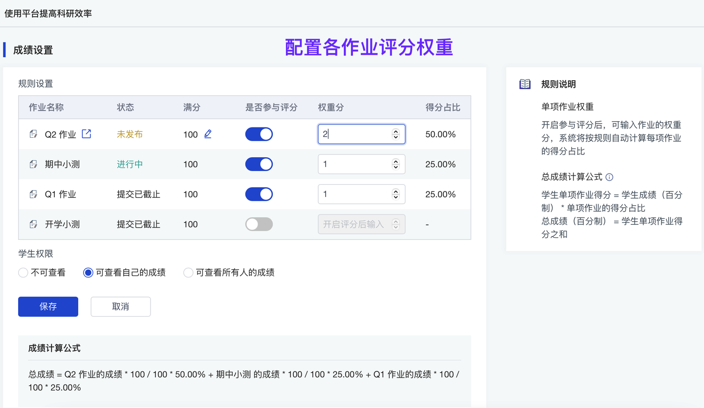 老师还可以管理线上成绩的发布展示,管控学生是否可以查看其他同学的成绩。