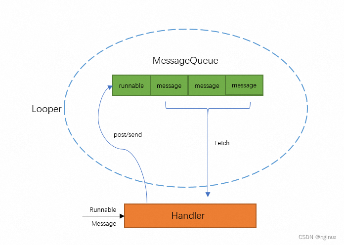 MessageQueue:消息队列,通过Handler发送的Message加入到该队列中,并且被Looper运行在Thread线程中不断取出,又被Handler执行。