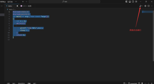 4.此时vscode就会打开创建的1.c文件了,你可以在该界面编写C语言代码。