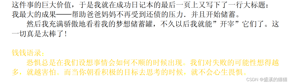她说的话当然让我很得意。我开心地朝钱钱望去,它正睡得迷迷糊糊,还轻轻地摇着尾巴。我打算明天一早就把这几句夸奖我的话记在成功日记本上。现在,我越来越发现自己在白天的时候就期盼着记成功日记。以前,我首先想到的是为什么有些事情自己没做好,而现在,我把更多的注意力放在我能够做到的事情上。所以.我更多的是去寻找解决办法,而不是寻找开脱的借口。
