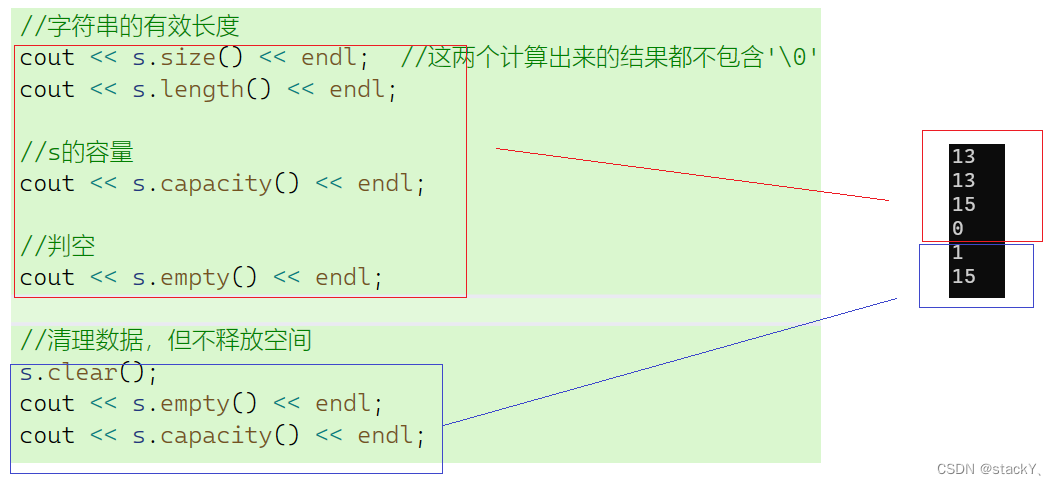 void Teststring_capacity1() { string s("Hello World!!"); //字符串的有效长度 cout << s.size() << endl; //这两个计算出来的结果都不包含'\0' cout << s.length() << endl; //s的容量 cout << s.capacity() << endl; //判空 cout << s.empty() << endl; //清理数据,但不释放空间 s.clear(); cout << s.empty() << endl; cout << s.capacity() << endl; }