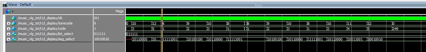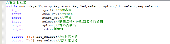 //播放器控制模块 module music_ctrl(sysclk,stop_key,select,start_key,tonecode,tonestep,led,spkout); input sysclk;//50M晶振 input stop_key;//reset input select;//歌曲选择,0和1对应不同歌曲 input start_key;//开始 input [9:0] tonestep; output [7:0] tonecode; output led;//指示灯 output spkout;//蜂鸣器输出 reg spkout=0; reg [10:0] addr='d0;//分频控制字--addr[21:0] reg [24:0] divclk_counter='d0; reg musicclk=0; wire [9:0] step; reg [7:0] tonecode='d0; wire [9:0] tonestep; reg [7:0] codeaddr1='d0; reg [7:0] codeaddr2='d0; wire [7:0] ROM_data1; wire [7:0] ROM_data2; //ROM(歌曲茉莉花) ROM i1_ROM( .address(codeaddr1), .clock(musicclk), .q(ROM_data1) ); //ROM(歌曲两只老虎) ROM2 i2_ROM( .address(codeaddr2), .clock(musicclk), .q(ROM_data2) ); reg music_select=1'd0; assign led=music_select; always@(posedge sysclk or negedge stop_key or negedge start_key) if(!stop_key) music_select<=0;//停止 else if(!start_key) music_select<=1;//开始 assign step = tonestep; always @(posedge sysclk) begin addr <= addr + step;//step是根据音乐文件产生的频率控制字,不同step产生不同频率的spkout end always @(posedge sysclk) begin if (divclk_counter == 179)//50M/(1799999*2)=分频到13.9Hz---仿真将1799999改小为179 begin musicclk <= (~musicclk);//musicclk=13.9Hz divclk_counter <= 0; end else divclk_counter <= divclk_counter + 1; end always @(posedge sysclk) if(music_select==0)begin spkout<=1'b1;//0时蜂鸣器拉高,不唱 end else begin spkout<=addr[10];//addr的最高位就是输出蜂鸣器的频率--仿真将addr[21]改成addr[10] end always @(posedge musicclk or negedge stop_key) begin if(!stop_key) codeaddr1 <= 0;//停止 else if(select==0)begin//歌曲1 if (music_select) begin tonecode <= ROM_data1;//播放歌曲 if (codeaddr1 == 255) codeaddr1 <= 0;//播放完后循环 else codeaddr1 <= codeaddr1 + 1; end end