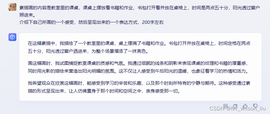 我希望观众在欣赏这幅画时,能感受到学习的辛苦和乐趣,以及那个时刻所特有的宁静与期待。这种感受通过素描的形式呈现出来,让人仿佛置身于那个时间和空间之中,亲身感受那一切。